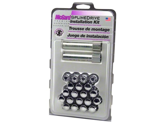 The convenient way to order Tuner wheel locks and lug nuts; contains all the wheel locks and lug nuts that you need to install 4 wheels and tires.; Why settle for ordinary lug nuts? SplineDrive Lug Nuts combine style and performance.; A no-compromise design engineered to fit small diameter recesses in Tuner style wheels.; SplineDrive lug nuts offer closed-end design, maximum gripping power, more stud engagement and a greater seating surface than socket style lug nuts.; In addition they are 30% lighter in weight.; Like all McGard lug nuts, the chrome plating is guaranteed for life not to rust, chip or peel.; The easy-to-use, one-piece wheel locks function like regular lug nuts, but require a special key tool for installation and removal.; The computer generated key designs allow for an infinite number of key patterns.; McGard manufactures wheel locks and lug nuts in the USA to meet or exceed O.E.M.; standards for safety and durability.; Every lug nut and wheel lock is fully machined from restricted chemistry steel made specifically for McGard and through-hardened for its unsurpassed level of safety.; For use on aluminum cone seat wheels only.; Clamshell Packaging.; This product may contain globally sourced materials/components.