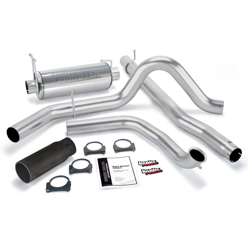 4-inch constant-diameter pipes with Straight-thru muffler cuts back pressure up to 81 Percent. Turbo Back System. 5-inch Cerakote Black tip. F-250 and F-350 Pickups and Excursions: Banks 4 inch Monster turbo-back stainless steel exhaust features streamlined turbine-outlet pipe, intermediate pipe and tailpipe all formed of stainless, heavy-wall tubing with constant-diameter bends to maximize flow, lower exhaust gas temps and slash backpressure up to 81 percent. (Available with or without a cast, large-bore Power Elbow housing). Designed to retain stock catalytic converter. The polished-stainless Monster muffler features a straight-through 4 inch diameter flow-path with a Banks-designed expansion chamber to dissipate the annoying mid-range exhaust drone that affects most straight-through designs. The muffler utilizes spun ceramic, very-high-temperature packing, more than doubles stock exhaust flow, and delivers an authoritative - but never intrusive - exhaust sound. And the 5 inch polished rolled-edge tip has an adjustable clamp for positioning on tailpipe. Get it in your choice of chrome-over stainless or high temp black! See this system with the Black tip and no Power Elbow. (And to help keep it looking good, there's a 1/2 inch air gap to keep heat from tarnishing the finish). Important: Some vehicle configurations require an extension kit for proper fit. Pickups other than standard-cab long-bed or extended-cab short-bed require Exhaust Extension Kit. Extended Cab Long Bed P/N 53517 required, Crew Cab Short Bed P/N 53516 required, Crew Cab Long Bed P/N 53518 required. Monster Exhaust System, Single Exit, Black Round Tip for use with 1999 Ford 7.3L, Truck, Catalytic Converter