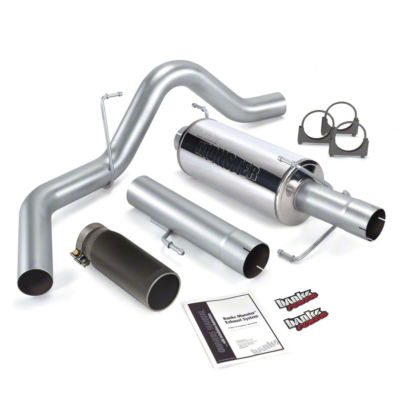 The 4 in. Monster exhaust system flows up to 122 percent better than stock and virtually eliminates backpressure. Banks streamlined 4 in. turbine outlet pipe with provision to retain stock catalytic converter, intermediate pipe(s) and tailpipe are formed of stainless, heavy-wall tubing with constant-diameter bends to maximize airflow and lower exhaust gas temps. Banks replaces the factorys restrictive muffler with a polished-stainless Monster muffler featuring a straight-through 4 in. diameter path that flows up to 129 percent better than stock.The Banks-designed expansion chamber dissipates the annoying mid-range exhaust drone that accompanies most straight-through mufflers. Monster muffler utilizes spun ceramic, very-high-temperature packing and delivers an authoritative - but never intrusive - exhaust sound. And the 5 in. polished rolled-edge tip has an adjustable clamp for positioning on tailpipe. Get it in your choice of chrome-over stainless or high temp black! (And to help keep it looking good, theres a 1/2 in. air gap to keep heat from tarnishing the finish) Monster Exhaust System, Single Exit, Black Round Tip for use with 2004-2007 Dodge 5.9L 325hp, SCLB/CCSB Standard Cab Long Bed or Crew Cab Short Bed