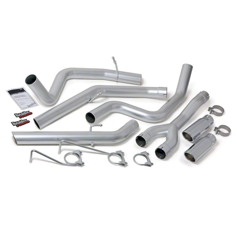 3-inch stainless mandrel-bent system. Safely clears spare tire. Removes stock muffler. Huge Chrome tips. Note: for factory Dual rear exit DPF-back. The 3.5 inch intermediate pipe and tailpipe are formed of stainless heavy-wall tubing with mandrel bends to maximize airflow, minimize backpressure and lower exhaust gas temperatures. The system safely clears the spare tire, shocks and brake lines. Monster exhaust includes exclusive round, straight-cut, polished-stainless rolled-edge tailpipe tip (with your choice of high temp Black or chrome-over stainless). Tip has an adjustable clamp for positioning on tailpipe. Single Exit Tip dimensions: 3.5 inch Tube - 4.38 X 12 inch. This system is also available as a Dual Exhaust with dual 3 inch Tube - 3.75 X 11 inch exhaust tips. Monster Exhaust System, Dual Rear Exit, Chrome Round Tips for use with 2014-2019 Ram 1500 3.0L EcoDiesel Key Features: Mandrel bent Stainless Steel construction Virtually eliminates backpressure Lowers exhaust gas temps Dramatically improves exhaust flow 3 inch stainless mandrel-bent system Safely clears spare tire Eliminates stock muffler Huge CHROME tips Dual rear exit DPF-back US Patent #5,581,111