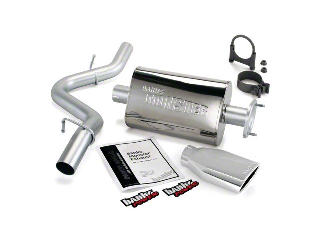 Huge 2.5-inch stainless mandrel-bent tailpipe. Flows up to 140 Percent better than stock. Chrome tip with Straight-thru Monster muffler. For maximum results, combine with Banks TorqueTube system.Huge 2.5 inch stainless mandrel-bent tailpipe with a polished or Black tip. Straight-thru Monster muffler flows up to 140 percent better than stock. Slashes backpressure, throaty sound. Constructed of heavy-gauge stainless steel, Banks Monster features a supersized, 2.5 inch tailpipe with a stainless tailpipe tip polished to a mirror finish. Banks Monster muffler, its straight-through performance muffler, is the industry's least restrictive. In comparison tests, Banks muffler flowed 501.2 cfm at 1 psi - a 140 percent improvement over the stock exhaust's 208.6 cfm, and about 44 percent better than the nearest competitor. Monster virtually eliminates backpressure from the catalytic converter back, for more power and efficiency - and an authoritative, yet civil, exhaust note. For maximum results, combine with Banks TorqueTube system. Includes: Stainless Monster muffler, Stainless 2.5 inch tailpipe, Stainless tailpipe tip in polished Chrome or black, Mounting hardware.