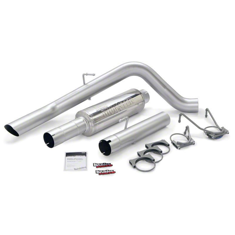 Improves airflow up to 122 percent. Monster Performance & Modest Price. Banks new Monster Sport Exhaust is one cool cat-back system! And its low price? Thats way cool. The system slashes backpressure, increases exhaust flow, improves fuel economy and delivers extra power to your rear wheels. Exhaust tip optional. 4 in. constant-diameter cat-back exhaust system. Virtually eliminates backpressure & nearly triples flow! Lowers exhaust gas temps. Straight-through Monster Muffler delivers a commanding exhaust note. Stainless Steel. Easy install. 5 in. rolled-edge polished tip is optional. Fully compatible with the Dodge factory warranty. 5-Year Limited Warranty.