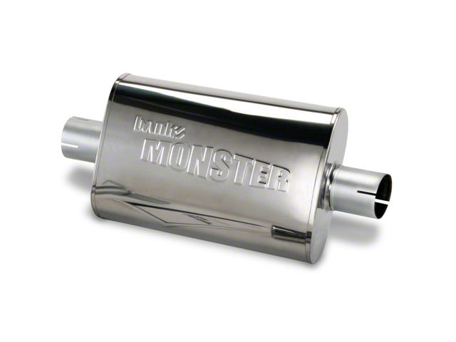 Monster Exhaust Benefits. Replacing the restrictive stock muffler with Banks free-flowing Monster muffler makes a huge difference in airflow, sound and performance. The Banks muffler has a large inlet and outlet. And in between, the exhaust flows straight through, instead of torturously winding its way back and forth inside hairpin chambers and building up back-pressure. And only Banks Monster muffler has an expansion chamber to alleviate the nasty drone that other straight-through mufflers are known for. Banks utilizes durable ceramic packing with a high temp rating so it won't degrade like fiberglass. Add it all together and you get a muffler that flows over three times better than stock and delivers a pleasing, throaty rumble!