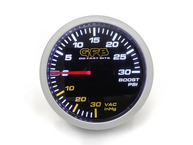 A critical tool for every turbo car! Knowing your boost pressure is vital to ensure longevity of your engine. GFB's 52mm mechanical boost gauge reads vacuum to -30inHg and boost to 30psi, with a bold and easy to read LED backlit face. When the ignition is turned off, the smoked lens darkens for a clean and stealthy look. Supplied with vacuum hose, mulit-size tee fiting, bezel and bracket to make installation easy.