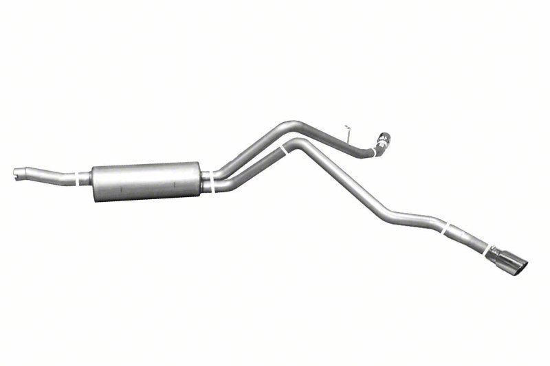 For the extremist who wants to take their truck to the next level, this dual bolt-on Cat back system is for you. This system exists behind the rear tires at an aggressive angle with a powerful exhaust tone. You will gain bold street looks with powerful dyno tuned and tested street performance gains. You can expect to experience gains on average of 15-20 horsepower. Gibson muffler provides a mean performance sound and complemented with polished Stainless Tip. Easy bolt-on installation. No welding required. Backed by a Lifetime Limited Warranty. If you want Extreme, this system is it.