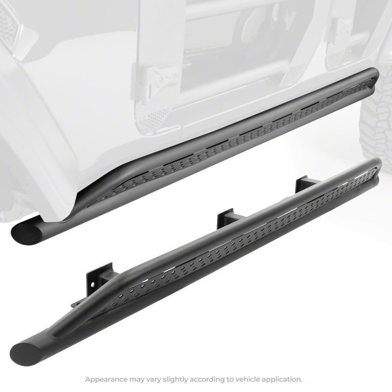 Protect the body and rocker of your Jeep with the Go Rhino Frame Mounted Sliders. This slider pair will give you that added strength and protection that is needed when out on the trails. The one piece welded construction adds extra durability and the zinc coated primer with matte black powder coat is perfect for all driving conditions-on and off road. The sliders mount to the frame of the vehicle and factory mount points along the rocker panels for true alignment to frame. Drilling is required to mount the sliders to keep them safe and secure on your vehicle. The Frame Mounted Sliders come with a 1 year warranty on materials and construction and a 1 year warranty on the Textured Black Finish.