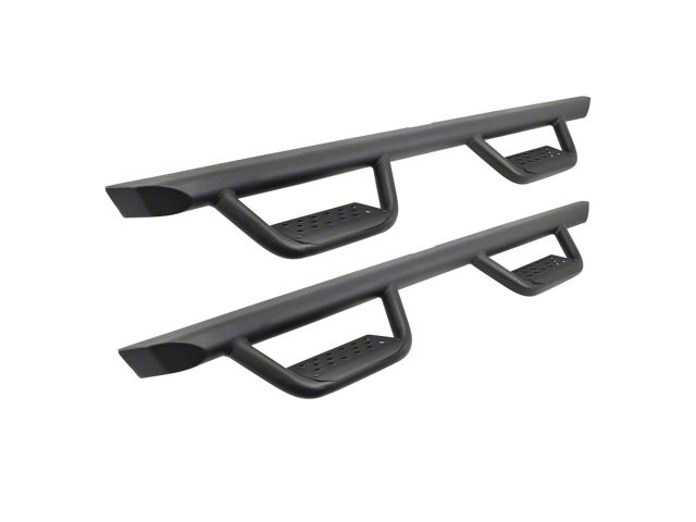 The Go Rhino Dominator Xtreme D2 combines the good looks and cool factor of the drop step design with the functionality of a traditional OE oval side step. The one-piece main bar is constructed of heavy duty steel tubing with the two welded hoops strategically placed beneath each door. The punched steel step pads offer no-slip grip in wet or muddy conditions and make entry and exiting a lifted vehicle easy. Installation is easy and the utilization of the OEM step mount locations means no drilling or cutting required. Hardware and brackets are included. The Xtreme D2 Side Steps come with a Limited Lifetime warranty on materials and construction and a 5 year warranty on the Textured Black Finish.