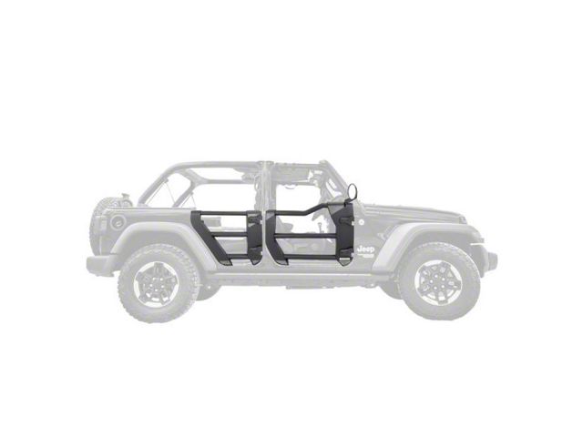 Go Rhino's Trailline Tube Doors remove the final barrier to the total, immersive outdoor experience while offering a stylish alternative to factory doors. Manufactured from 2" steel tubes fully welded onto 16-gage steel plates, these doors are designed for both utility and ease of installation. The easy-grip ball latch handle double-clicks for both easy-close and hard-close. Adjustable rubber plungers balance the door to the frame to eliminate vibration and rattling. The cast steel hinges utilize the factory hinge pin and the factory nuts for easy installation.