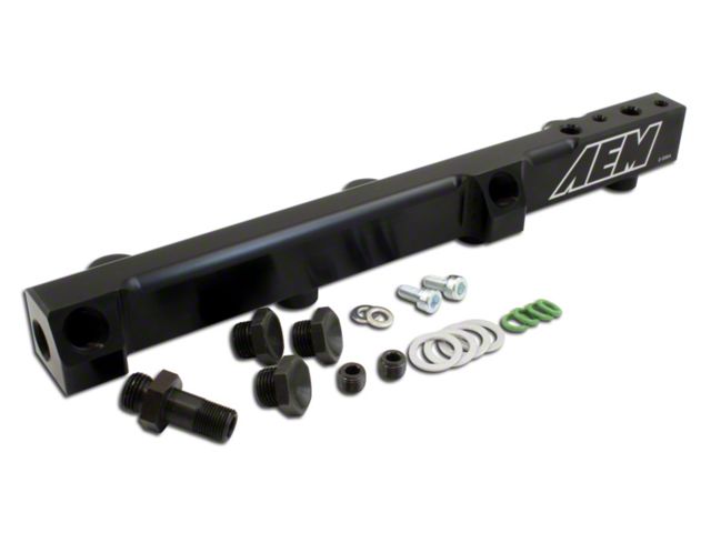 AEM High Volume fuel rails feature a 1/2-inch fuel bore to support fuel flow for applications up to 1,000 horsepower. This large bore also dampens backpressure pulses created by larger injectors and works perfectly with stock injector sizes. An additional 1/8th NPT port is included to accommodate a nitrous set up or fuel pressure gauge. A custom fuel line fitting is included for the factory fuel line, and in most cases the ends of each rail are pre tapped to accept -6 AN or 9/16"x18 fittings for users who want to use custom fuel lines.