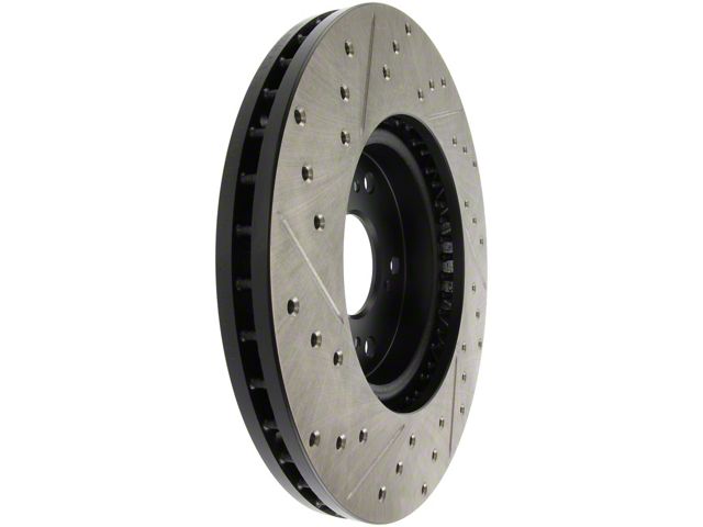 StopTech Drilled and Slotted Sport Rotors are 1-piece direct replacement brake discs for factory brake systems and stock calipers that look great behind your wheels and offer significantly improved braking performance. The unique cross-drilling and slotting aids with heat and brake dust dispersal; prevents glazing of the pads; adds bite and improves wet and dry braking performance. Built to last; the black e-coating provides protection from corrosion and the high carbon metallurgy (in most applications) offers quieter operation; better crack resistance and increased performance.