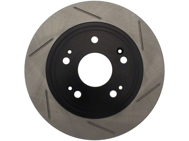 StopTech Slotted Sport Rotors are 1-piece direct replacement brake discs for factory brake systems and stock calipers that look great behind your wheels and offer significantly improved braking performance. The unique slotting aids with heat and brake dust dispersal; prevents glazing of the pads; adds bite and improves wet and dry braking performance. Built to last; the black e-coating provides protection from corrosion and the high carbon metallurgy (in most applications) offers quieter operation; better crack resistance and increased performance.