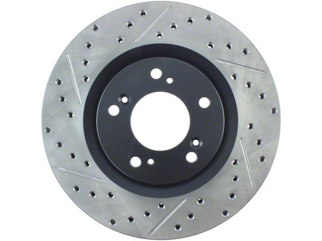 StopTech Drilled and Slotted Sport Rotors are 1-piece direct replacement brake discs for factory brake systems and stock calipers that look great behind your wheels and offer significantly improved braking performance. The unique cross-drilling and slotting aids with heat and brake dust dispersal; prevents glazing of the pads; adds bite and improves wet and dry braking performance. Built to last; the black e-coating provides protection from corrosion and the high carbon metallurgy (in most applications) offers quieter operation; better crack resistance and increased performance.