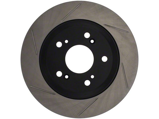 StopTech Slotted Sport Rotors are 1-piece direct replacement brake discs for factory brake systems and stock calipers that look great behind your wheels and offer significantly improved braking performance. The unique slotting aids with heat and brake dust dispersal; prevents glazing of the pads; adds bite and improves wet and dry braking performance. Built to last; the black e-coating provides protection from corrosion and the high carbon metallurgy (in most applications) offers quieter operation; better crack resistance and increased performance.