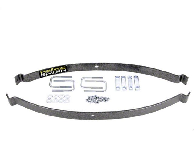 Hellwig's medium-duty EZ-990 Helper Springs pack a lot of capability in every box. Packaged complete with the same heavy duty powder coated and plated components, hardware and installation instructions as our heavy duty helper spring products, these kits are designed for the vehicles that need lighter assistance in carrying a load. Simple bolt on design using common hand tools provide the installer ease of installation and the vehicle owner hassle free use. Ideally suited for light towing and loads, these units are fully adjustable using the heavy duty U-bolts included in the kit using simple hand tools. If your tow and haul needs change, simply adjust the heavy duty U-bolts to suit the new load requirements. Once installed and adjusted you are free to haul or tow with greater control and stability. Manufactured with heat treated ASTM 5160 alloy spring steel in our California based facility, these units are rated up to 2,000 lb. level load carrying capacity. They are a great cost effective spring solution and can be adjusted independently for uneven side to side loads.