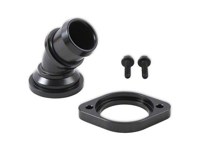 These water necks fit Mopar Gen III Hemi engines, and are ideal for use in engine swaps since the swivel allows adjustment to accommodate custom radiator hoses. The billet aluminum with black anodized finish looks great and prevents corrosion. Choose from outlets with a 45 degree or 90 degree angle (both swivel 360 degrees before bolts are tightened up).
