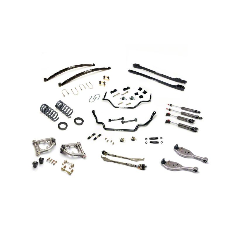 Hotchkis Sport Suspension (80040-2) 1964½-66 Mustang Stage 2 TVS (Total Vehicle System) kit. The Hotchkis Stage 2 TVS Kit is an all-inclusive kit that has been designed and tested as a system for your 1964½-66 Ford Mustang Coupe, Fastback or Convertible. No need to mix and match components since this kit contains Geometry-Corrected Upper Tubular A-Arms, Tubular Lower Control Arms with corrected ball joint angle necessary for lowered ride heights. Lower control arm adjustability is made even easier with the included Adjustable Strut Rods that dramatically improve stability and superior driver control thanks to increased positive caster and Spherical Heim Joints. Superior ride height is achieved with our front coil springs, 700 lbs/in with 0.5 in. lower ride height, and our heavy-duty multi-leaf Rear Leaf Springs, 180 lbs/in with 1.5 in. lower ride height. Next is our lightweight 32mm (1.25 in.) 4130 Tubular Steel Front Sway Bar and Lightweight 22mm (0.875 in.) DOM Tubular Steel 3-Way Adjustable Rear Sway Bar that allow for suspension tuning for optimum track or street performance. The Hotchkis 1.5 Street Performance Series front and rear Shock Absorbers by Fox specifically tuned for your 1964½-66 Mustang provide smooth ride, exceptional control, and balanced handling. Subframe Connectors are included to add rigidity to reduce chassis flex. Other than a few minutes of welding the direct install Subframe Connectors, this is a Direct Bolt-On installation kit requiring no vehicle modifications. This kit comes with Premium Mounting Hardware Including: adjustable Tie Rod Sleeves, Steel U-Bolts Laser Cut Axle Mounts & Frame Rail Mounts, Polyurethane Bushings and Grade 8 Bolts, TIG Welded Steel Dogbone End Links with Polyurethane Bushings. The Hotchkis Stage 2 TVS kit for the 1964½-66 Mustang offers a sleek lowered stance, dramatically improved handling, steering response and driver control by reducing body roll while giving you a sporty yet comfortable ride.