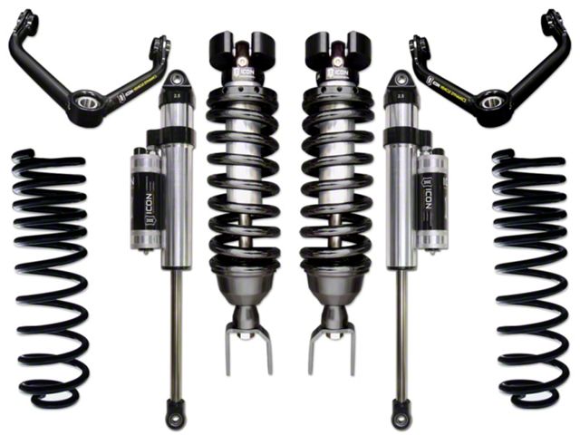 ICON Vehicle Dynamics Dodge Ram 1500 4WD suspension systems are designed with maximum performance and the serious driver in mind. ICON engineers' primary focus is to increase wheel travel and damping ability, which translates into outstanding vehicle control and ride quality both on and off-road. This system includes vehicle-specific tuned 2.5" coilover shocks featuring an internal reservoir for exceptional cooling properties and ICON-engineered Eibach coil springs for superior vehicle "feel" through the range of travel. These coilovers are also height adjustable from .75-2.5" allowing the use of larger, more aggressive wheel and tire combinations. ICON 2.5 Aluminum Series rear shocks with CDC Valve utilize a vehicle-specific valving that balances the performance of the truck from front to rear. The ICON Vehicle Dynamics 2009-2018 Dodge Ram 1500 4WD Stage 5 suspension system is an excellent choice for those drivers looking to enhance the capabilities of their pickup on the road as well as in the dirt.