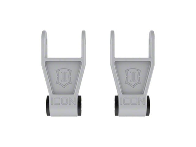 Fine tune the rear ride height on your 2010-2023 Ford F-150 or 2010-2024 Ford F-250/F-350 Super Duty with ICON Vehicle Dynamics' Billet Aluminum Lowering Shackle Kit. CNC machined from 6061 aviation grade aluminum; these billet shackles offer increased strength compared to the thin steel of the stock units to better withstand the stresses of aggressive off-road use. Their increased length also lowers the rear ride height of the truck by 1", requiring less front lift to achieve a level stance or to assist in rear ride height tuning with aftermarket leaf springs. Their gusseted design ensures proper bushing clearance to allow fitment for stock leaf springs, ICON F-150 Multi-Rate Leaf Springs, ICON Super Duty leaf springs, and most other aftermarket spring packs for a wide range of suspension setup options. Pre-installed, replaceable, press in OE Ford bonded bushings make for an easy install, require no periodic greasing, and offer noise free operation while still cycling full suspension travel. The shackles look as great as they perform with a satin gray anodized finish.