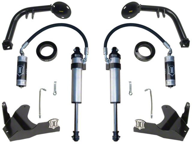The S2 Secondary Shock System utilizes the factory lower control arms and maintains OE track width while a combination of a billet aluminum shock tower adapters, fabricated shock hoops, and steel skid plates (with incorporated shock mounts) make for a straightforward install with the exceptional build quality you would expect from an ICON Vehicle Dynamics product. The system was designed to eliminate the need for any major alteration of the vehicle's frame or any other factory suspension components, and the components are 100% removable in case the system is to be installed on another vehicle. The modular design of the S2 kit also allows for standalone installation of the skid plates, which provides the added benefit of protecting the factory lower control arms from potential trail damage that can be experienced while off-road.
