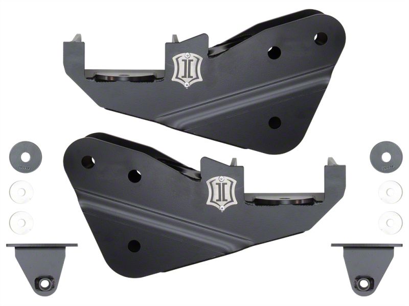 The ICON Radius Arm Drop Kit for the 2017-2022 Ford F-250/F-350 Super Duty 4WD allows the use of the stock or aftermarket radius arms with ICON 4.5-7 lift suspension systems. This kit consists of fabricated radius arm drop brackets, CNC laser cut and brake-formed from steel plate and engineered to withstand the stresses of aggressive off-road driving. The drop brackets look as great as they perform with a durable semi-gloss black powder coat finish. Wheel with confidence knowing that the brackets are covered by ICON's Limited Lifetime Warranty.