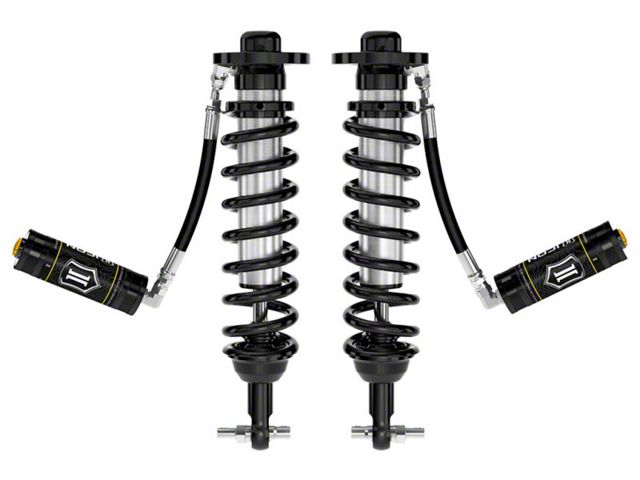 ICON Vehicle Dynamics V.S. Series 2.5" remote reservoir coilover shocks are an incredible upgrade for the front end of the 2021-2023 Ford F150 4WD. ICON's Vehicle-specific valving provides a sport tuned feel on and off-road while offering 0-2.75" of lift height adjustability for use of larger, more aggressive wheel and tire combinations. The larger 2.5" shock body and increased piston area over stock components provides improved damping ability and outstanding ride characteristics across varying types of terrain. Remote reservoirs ensure optimum performance by increasing the duration of consistent damping regardless of situation, keeping the shocks at a cooler operating temperature during heavy use. When paired with ICON rear 2.0 Aluminum Series or 2.5 Aluminum Series shocks, vehicle control will be balanced front to rear resulting in the best overall driving experience for your F150.