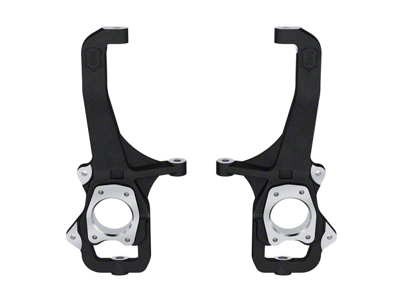 The ICON Vehicle Dynamics Front Steering Knuckle Kit is an essential component of the ICON 6" Lift Performance Suspension System for the 2022-2024 Toyota Tundra and 2023-2024 Toyota Sequoia, featuring a 4" drop to compliment the ICON high-clearance front crossmembers. Their single piece, high-strength CNC machined ductile iron construction ensures strength and have been engineered to withstand the stresses of aggressive off-road use while minimizing un-sprung weight and maintaining factory track width. Optimized steering arm geometry also virtually eliminates bump steer through the entire wheel travel range for predictable handling characteristics. These steering knuckles will stand the test of time with replaceable steering stops, a durable black powder coat finish, and ICON's Limited Lifetime Warranty.