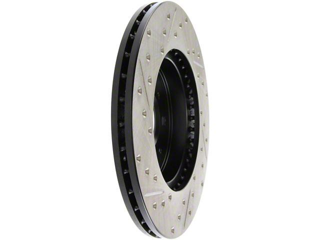 StopTech Drilled and Slotted Sport Rotors are 1-piece direct replacement brake discs for factory brake systems and stock calipers that look great behind your wheels and offer significantly improved braking performance. The unique cross-drilling and slotting aids with heat and brake dust dispersal; prevents glazing of the pads; adds bite and improves wet and dry braking performance. Built to last; the black e-coating provides protection from corrosion and the high carbon metallurgy (in most applications) offers quieter operation; better crack resistance and increased performance.