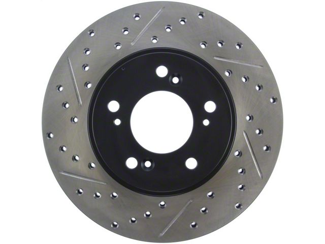 StopTech Drilled and Slotted Sport Rotors are 1-piece direct replacement brake discs for factory brake systems and stock calipers that look great behind your wheels and offer significantly improved braking performance. The unique cross-drilling and slotting aids with heat and brake dust dispersal; prevents glazing of the pads; adds bite and improves wet and dry braking performance. Built to last; the black e-coating provides protection from corrosion and the high carbon metallurgy (in most applications) offers quieter operation; better crack resistance and increased performance.