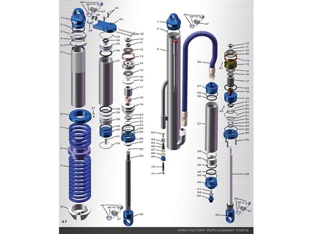 Our product line consists of Coilover, Bypass, and Smoothie shocks as well as Bumpstops, tools and racing jacks. Our OEM and UTV upgrade kits offer serious performance upgrades and simple bolt-on installation. They are available for stock vehicles or those modified with aftermarket lift kits or long travel suspensions. King Shocks are serviced using simple hand tools when the time comes. You can order a seal kit and return them to factory fresh condition yourself or send them to the factory for service. All parts used in our products are machined in house at our Garden Grove, California facility from billet alloy materials on precision equipment to exacting standards and hand assembled by our trained technicians.