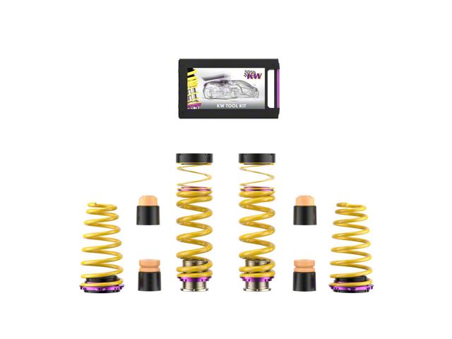 KW (H.A.S) Height Adjustable Spring kits are a great alternative to conventional lowering springs. You are no longer stuck with a fixed lowering height. KW H.A.S. systems allow you to adjust the vehicle ride height with the KW height adjuster even after the kit has been installed. Your vehicle not only gets a more dynamic look, but also the steering behavior and response of the standard dampers becomes more agile. All driver assistance systems and comfort features of a factory adaptive or electronic suspension remain operational and work harmoniously with our vehicle specific spring set up. KW uses high-quality springs made of chrome-silicon steel with spring rates designed specifically for each respective OE suspension damper and wheel load. KW's expertise and engineering ensure the spring rates will pair perfectly with the different damper characteristics of your factory adaptive electronic suspension. Along with the use of high quality materials and the included KW ride height Adjustment - mechanisms, our KW H.A.S. kits always includes the vehicle-specific bump stops with dust protection system to protect your factory suspension against wear & tear caused by road grime and debris. Similar to a coilover suspension, the KW H.A.S kit allow a continuous adjustable ride height within a tested range, something not possible with conventional lowering springs. The dust protection elements and spring perches included in the delivery, when applicable, are always adjusted to the maximum technically possible lowering, typically limited by the factory dampers. With KW height adjustable springs, a sporty and harmonious driving behavior can be achieved without the driving dynamics of performance-oriented vehicles suffering. As with all KW suspension products our engineers develop vehicle specific parameters and spring specifications which undergo comprehensive testing on the Nurburgring Nordschleife and in our KW 7-post Driving Dynamic Test Center.