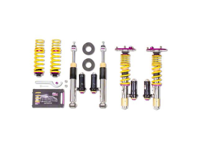 Using the Nordschleife as its testing grounds and the 7-post rig, KW developed its V4 Clubsport coilover kit. Wheel loads, vehicle weight and chassis reinforcements (increased body stiffness) can all be taken into consideration with Adjustment capabilities of the V4 Clubsport. The KW Clubsport coilovers combine KW's high-end racing technology with maintenance-free KW OEM quality components. Designed to provide you the ideal product to utilize the full potential of your sports car during autocross, track days, high performance drivers education (HPDE) courses, club racing, and is tested rigorously on race tracks such as the Nurburgring Nordschleife. Race teams rely on KW's racing expertise and experience for their vehicle setup. This same championship winning pedigree is mirrored in the development of each one of the KW Clubsport coilover systems. Similar to the KW Competition suspension used in international motorsports, the KW V4 Clubsport coilover kit allows fine tuning of the compression damping separately in the low-speed and high-speed range. The click adjustments of the TVCLH-A valve technology make for easy Adjustment directly on the reservoir. You can modify the low-speed compression damping with 6 precise clicks with the purple low speed Adjustment dial and directly beneath it the golden Adjustment wheel provides an additional 14 precise clicks of high speed compression adjustment. In addition, the TVR-A technology provides 16 clicks to noticeably adjust the rebound damping independently of the compression damping. If you would like to adjust the KW V4 Clubsport coilover kit it can easily be adjusted for more comfort or to an alternative setup for a new race track. The KW V4 Clubsport benefits from the same motorsports technology that has proven its endurance with multiple overall wins at the ADAC Zurich 24h Nurburgring race.