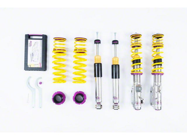 Cutting-edge motorsports technology for more performance on the road. Like every suspension product developed by KW automotive, the suspension manufacturer, and manufactured in Germany, the KW V3 Coilover suspension kit also provides a significant plus in safety reserves in road traffic. Thanks to the chassis with its high-quality dampers, springs, and elastomer spring elements, pitching and rolling movements during load changes such as evasive maneuvers, cornering, acceleration, and braking are significantly reduced. The braking distances are also shortened. Thanks to improved support and feedback, drivers not only feel safer but driving in everyday life becomes even safer. With compression and rebound stage damping, that can be set separately and independently of each other, the damper setup can be customized to your personal driving preferences or vehicle changes such as weight, tire characteristics, or altered vehicle rigidity. True performance optimization is only possible with this unique, patented system. For example, this allows the compression damping force to be increased and get more grip from the tires, to improve cornering behavior and reduce squat without simultaneously altering the rebound stage damping which is optimally matched to the spring rate, a scenario which results in reduced grip and the associated loss of performance. The KW V3 coilover kit is the ideal tool for performance-oriented drivers and experienced tuning enthusiasts who place a strong emphasis on the overall performance of their suspension. The Variant 3 features patented TVR-A and TVC-A technology that provides separately adjustable rebound and compression damping. The extensive adjustment range of the independently configurable rebound and compression make it easy to directly influence the steering behavior, directional stability, grip and handling characteristics for confident and repeatable results at the limit of driving dynamics.