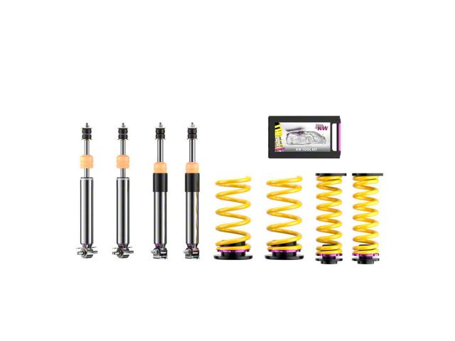 Cutting-edge motorsports technology for more performance on the road. Like every suspension product developed by KW automotive, the suspension manufacturer, and manufactured in Germany, the KW V3 Coilover suspension kit also provides a significant plus in safety reserves in road traffic. Thanks to the chassis with its high-quality dampers, springs, and elastomer spring elements, pitching and rolling movements during load changes such as evasive maneuvers, cornering, acceleration, and braking are significantly reduced. The braking distances are also shortened. Thanks to improved support and feedback, drivers not only feel safer but driving in everyday life becomes even safer. With compression and rebound stage damping, that can be set separately and independently of each other, the damper setup can be customized to your personal driving preferences or vehicle changes such as weight, tire characteristics, or altered vehicle rigidity. True performance optimization is only possible with this unique, patented system. For example, this allows the compression damping force to be increased and get more grip from the tires, to improve cornering behavior and reduce squat without simultaneously altering the rebound stage damping which is optimally matched to the spring rate, a scenario which results in reduced grip and the associated loss of performance. The KW V3 coilover kit is the ideal tool for performance-oriented drivers and experienced tuning enthusiasts who place a strong emphasis on the overall performance of their suspension. The Variant 3 features patented TVR-A and TVC-A technology that provides separately adjustable rebound and compression damping. The extensive adjustment range of the independently configurable rebound and compression make it easy to directly influence the steering behavior, directional stability, grip and handling characteristics for confident and repeatable results at the limit of driving dynamics.
