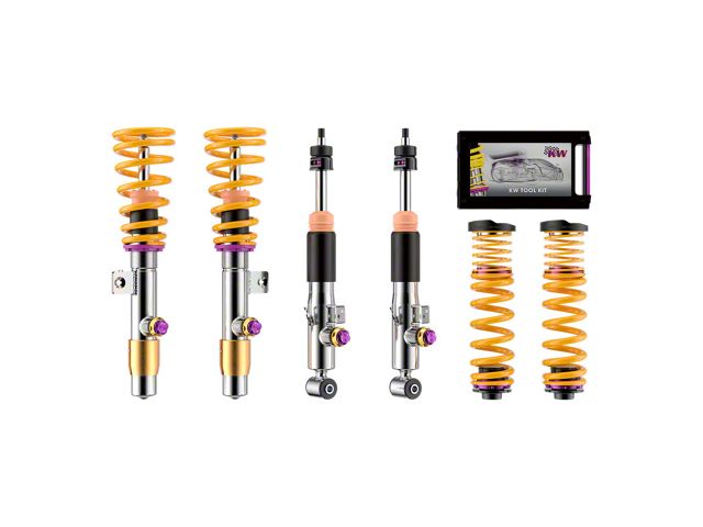 KW V4 coilovers are a combination of our innovative, race proven technology, as well as decades of experience tuning high end sports cars, super sedans and exotics such as the Audi R8, Audi RS6, BMW M5, Lamborghini Aventador LP 750-4 SV, Dodge Charger SRT Hellcat, Mercedes AMG GT and more. In addition to the individually adjustable ride height the KW V4 coilover kit allows an independent Adjustment -f the rebound damping as well as the low-speed and high-speed compression damping. Each KW V4 coilover kit is delivered with a vehicle-specific comfort setting and with the integrated Adjustment -controls the damping characteristics can be set quickly and intuitively transformed to an optimized performance setup. The 3-way adjustable high-performance dampers in the KW V4 coilover kits feature independent Adjustment -f the rebound damping utilizing patented TVR-A technology, as well as the low speed and high speed compression damping utilizing TVCLH-A technology. The KW V4 coilovers are based upon successful race technology utilized by multiple overall winners of the ADAC Zurich 24h Nurburgring race. The new KW V4 coilovers are exclusively developed for select high-performance vehicles, which benefit greatly from the KW suspension technology -o improve their driving dynamics.