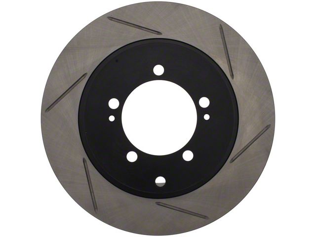 StopTech Slotted Sport Rotors are 1-piece direct replacement brake discs for factory brake systems and stock calipers that look great behind your wheels and offer significantly improved braking performance. The unique slotting aids with heat and brake dust dispersal; prevents glazing of the pads; adds bite and improves wet and dry braking performance. Built to last; the black e-coating provides protection from corrosion and the high carbon metallurgy (in most applications) offers quieter operation; better crack resistance and increased performance.