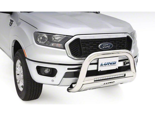 Protects your front end from flying debris with 3.5 inches of oval steel tubing. These bull bars also boost your visibility with an integrated 20 in. LED light bar. The included heavy duty light bar illuminates your night driving with a bright flood beam pattern and is easily wired into your factory light wiring, or a wiring harness can be purchased separately. Available in black textured powder coat or polished T304 stainless steel finish. Our popular LUND bull bars may now be ordered with a wire harness kit. The wire harness kit is also sold separately for lighting and accessories up to 30 Amps. LUND's bull bars with LED light bar and wiring kit is the total package to see and be seen, providing complete front end style, lighting and protection.