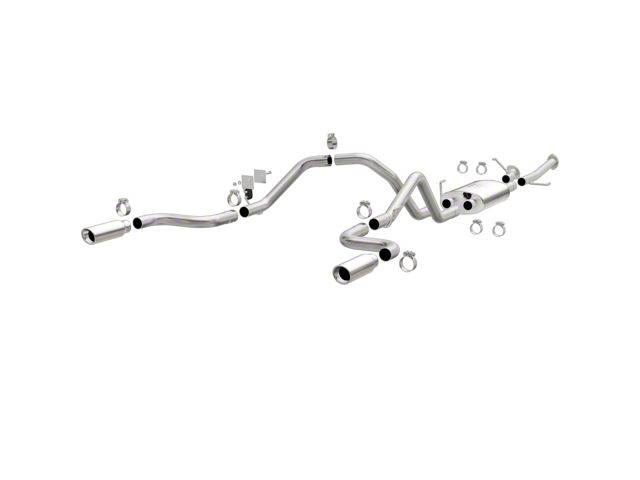 The MagnaFlow 2014-2021 Toyota Tundra Street Series Cat-Back Performance Exhaust System brings out the personality of your 4.6L, 5.7L 2014-2021 Toyota Tundra with our signature resonant, powerful engine tone and dyno-proven performance. Thanks to its fast-flowing, mandrel bent 2.5in. main piping and 1 Straight-Through mufflers ending in a Dual Split Rear exit with 3.5in. Polished Clamp-On Single Wall Angle Cut Rolled Edge tips, this Toyota Tundra exhaust kit has the performance chops to match its sporty sound and appearance. Upgrade your ride to the next level with an exhaust that has the pipes to put other Toyota Tundra's to shame. With this system your vehicle will be producing Aggressive exterior and Moderate interior sound levels while leaving other cars and trucks feeling envious at every stoplight. Exhaust kit 15305 features a cat-back layout that replaces your ride's stock exhaust components from near the catalytic converter on back. Extensive 3D scanning during development has resulted in a direct-fit design that you can easily install yourself. 15305 is produced using CNC precision robotic manufacturing techniques and is backed by MagnaFlow's 1-year limited finish warranty and limited lifetime construction warranty.