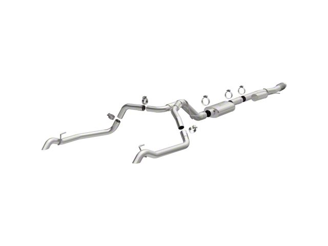 The MagnaFlow Chevrolet Silverado 1500/GMC Sierra 1500 Overland Series Cat-Back Performance Exhaust System #19626 is engineered to enhance the off-road capabilities, performance and sound of your 2019-2023 Chevy Silverado 1500 or GMC Sierra 1500 equipped with the 6.2L engine option. The high clearance design of this exhaust kit increases your rig's capacity to traverse any sort of terrain, while the incorporation of an NDT (No Drone Technology) resonator helps mitigate the droning frequencies that can otherwise occur at highway cruising speeds. #19626 features 3.5" diameter main piping that passes through an 18" oval bodied straight-through muffler and 14" NDT reflection chamber before terminating in a dual split rear exit with high clearance tailpipes. Exhaust kit #19626's easy-to-install direct-fit design is engineered to replace all of your truck's stock exhaust components from near the catalytic converter on back. This Chevrolet Silverado 1500/GMC Sierra 1500 performance exhaust system is made of durable, corrosion resistant stainless steel and produced using advanced CNC precision robotic manufacturing techniques, all backed by MagnaFlow's limited lifetime warranty.