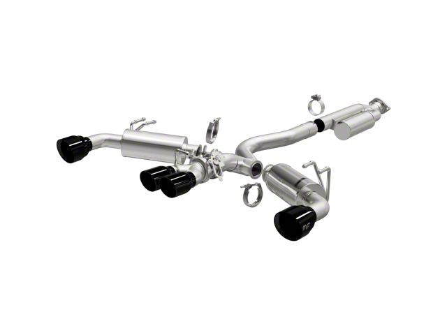 The MagnaFlow Toyota GR Corolla NEO Series Cat-Back Performance Exhaust System #19631 turns your ultimate sporty compact into a JDM-like beast that stays at the head of the pack thanks to its modern take on MagnaFlow's signature sound and renowned dyno-proven power gains. This 2023 GR Corolla exhaust kit represents an all-around performance improvement for your GR's 1.6L without compromises, even going so far as to retain your OEM vehicle's factory controllable exhaust valve option using MagnaFlow's own cast 304 stainless steel valves. Additionally, #19631 seamlessly integrates MagnaFlow's No Drone Technology (NDT) to ensure optimal driver enjoyment, free of any unwanted droning noises that can otherwise occur at cruising speeds. Exhaust kit #19631 features 3" mandrel bent main piping that passes through an 11" NDT tuned chamber, smooth Y-pipe transition and two 11" straight-through performance mufflers before terminating in a quad center split rear exit with 4.5" outer and 3.375" inner tips featuring a double wall, angle-cut logo etched design with a black chrome finish. This performance exhaust features an easy-to-install, direct-fit design that is engineered to replace all OEM exhaust components from near the catalytic converter on back. #19631 is made of durable, corrosion resistant stainless steel and produced using advanced CNC precision robotic manufacturing techniques, all backed by MagnaFlow's limited lifetime warranty.