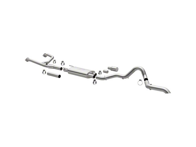 The MagnaFlow Toyota Tundra Overland Series performance exhaust system #19604 is built to withstand anything that Mother Nature throws at it thanks to the elevated ground clearance and superior departure angles it offers compared to your truck's existing exhaust system. #19604 makes this all possible thanks to its single tipless, high tuck tailpipe that exits the rear driver's side. The system's cat-back design replaces all of your truck's stock exhaust components from near the catalytic converter on back. Our innovative NDT (No Drone Technology) resonators are engineered to keep droning noises in check using quarter-wave passive noise cancellation, improving your situational awareness while out on the trail and facilitating a more comfortable ride when cruising the highway. Exhaust kit #19604 is compatible with all 2022-2023 Toyota Tundra crew cab and extended cab/standard bed configurations equipped with the 3.5L V6 engine option. #19604 features 3" diameter, mandrel bent main tubing that flows through a fast-flowing, straight through 5"x11"x22" offset/offset same-side muffler with internal branch pipe, all with a premium brushed finish. This Toyota Tundra performance exhaust system is made of durable, corrosion resistant stainless steel and produced using advanced, CNC precision robotic manufacturing techniques, all backed by MagnaFlow's limited lifetime warranty.