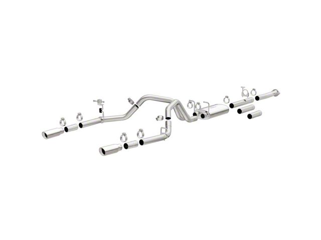 The MagnaFlow Street Series Cat-Back Performance Exhaust System 19027 brings out the personality of your Truck with our signature resonant, powerful engine tone and dyno-proven performance. Thanks to its fast-flowing, mandrel bent 3.5in. main piping and 1 Straight-Through mufflers ending in a Dual Split Rear exit with 4in. Polished Clamp-On Double Wall Angle Cut Rolled Edge tips, this Truck exhaust kit has the performance chops to match its sporty sound and appearance. Upgrade your ride to the next level with an exhaust that has the pipes to put other Truck's to shame. With this system your vehicle will be producing Aggressive exterior and Moderate interior sound levels while leaving other cars and trucks feeling envious at every stoplight. Exhaust kit 19027 features a cat-back layout that replaces your ride's stock exhaust components from near the catalytic converter on back. Extensive 3D scanning during development has resulted in a direct-fit design that you can easily install yourself. 19027 is produced using CNC precision robotic manufacturing techniques and is backed by MagnaFlow's 1-year limited finish warranty and limited lifetime construction warranty.