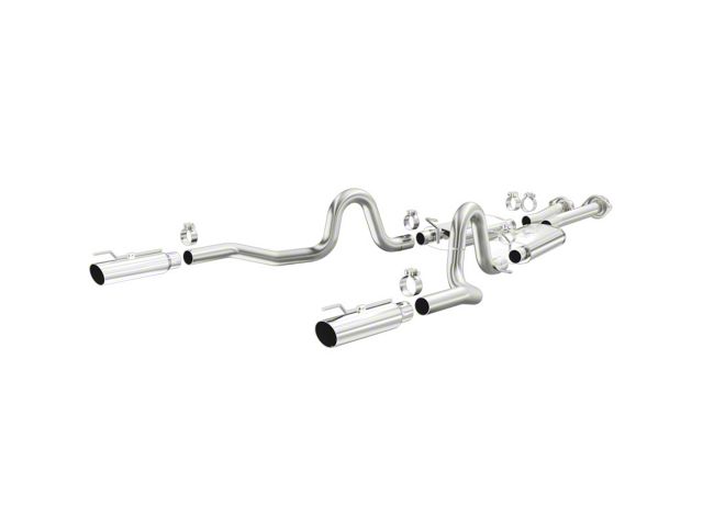 The MagnaFlow 1999-2004 Ford Mustang Street Series Cat-Back Performance Exhaust System brings out the personality of your 4.6L 1999-2004 Ford Mustang with our signature resonant, powerful engine tone and dyno-proven performance. Thanks to its fast-flowing, mandrel bent 2.5in. main piping and 2 Straight-Through mufflers ending in a Dual Split Rear exit with 3.5in. Polished Clamp-On Single Wall Angle Cut Cut Edge tips, this Ford Mustang exhaust kit has the performance chops to match its sporty sound and appearance. Upgrade your ride to the next level with an exhaust that has the pipes to put other Ford Mustang's to shame. With this system your vehicle will be producing Moderate exterior and Mild interior sound levels while leaving other cars and trucks feeling envious at every stoplight. Exhaust kit 15671 features a cat-back layout that replaces your ride's stock exhaust components from near the catalytic converter on back. Extensive 3D scanning during development has resulted in a direct-fit design that you can easily install yourself. 15671 is produced using CNC precision robotic manufacturing techniques and is backed by MagnaFlow's 1-year limited finish warranty and limited lifetime construction warranty.