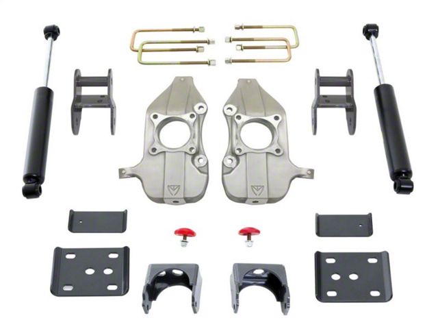 Our 2/4 drop kit is a great way to lower your vehicle without sacrificing ride quality. This kit comes with our patent pending forged aluminum spindle which keeps the ride close to factory and allows for larger heavier wheels. The rear comes with a 5 inch flip kit to drop the axle and a 1 inch lifted hangers to bring the vehicle back to a 4 inch drop. We then include rear twin tube shocks for better ride control. What makes this kit great is you can always add or remove components to get the look you're after.