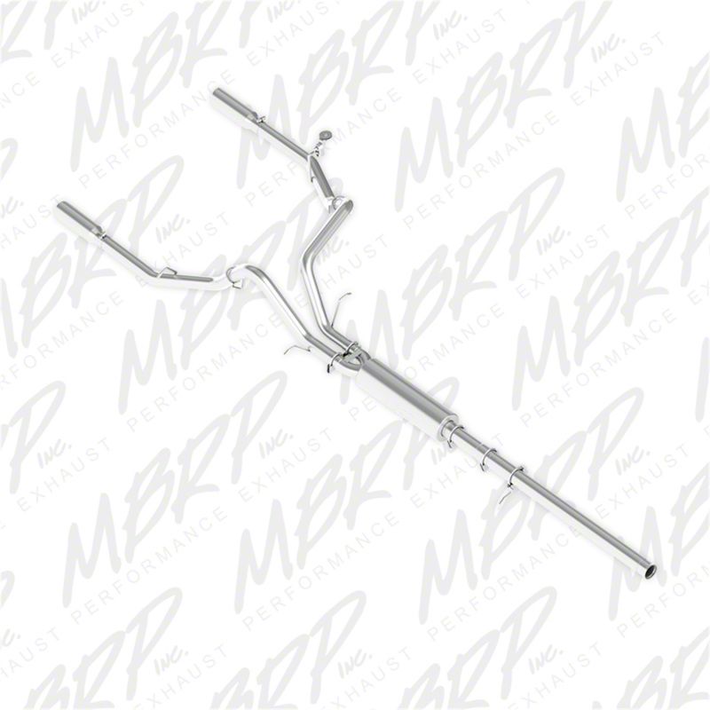 This Cat Back Exhaust System includes an extension pipe, mid-pipe, muffler, over-axle pipes, tailpipes, hardware, and 3.5 in. OD tips. The dual split rear exit design and MBRP signature styling contribute to a standout appearance and excellent sound.