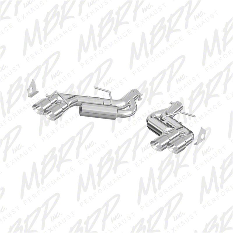 This Axle-Back Exhaust System includes an extension pipe, tailpipe, hardware, and quad 4in outlet diameter tips. It features a dual split rear exit and is designed for race applications. The system utilizes Helmholtz Technology for optimal performance and sound.