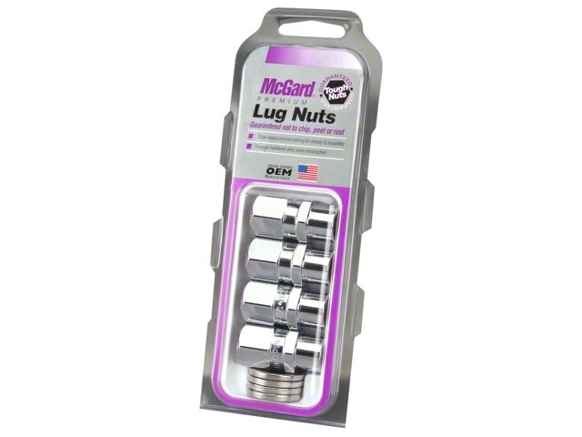 Chrome plated lug nuts lead a tough life. Think about it, harsh elements, nasty corrosive wheel cleaners and lead-foot drivers. Not to mention overzealous impact guns and loose fitting lug wrenches. This kind of treatment destroys ordinary lug nuts which turns even the best looking wheels ugly. Tough Nuts can take the punishment and keep your wheels looking beautiful. Tough Nuts are guaranteed for life not to rust, chip or peel. McGard manufactures lug nuts in the USA to meet or exceed O.E.M. standards for safety and durability. Every lug nut is fully machined from restricted chemistry steel made specifically for McGard and through-hardened for its unsurpassed level of safety. McGard's plating process includes several layers of nickel and one layer of microporous chrome producing a superior finish while protecting against rust. Tough Nuts are designed and built for the real world, because life is tough. Open-ended Drag Racing style with a .490 Shank length for use with Centerline Convo Pro and Weld Pro Star wheels. Contains polished stainless steel washers and black nylon allen plugs. This product may contain globally sourced materials/components.