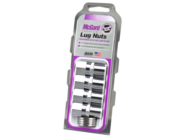 Chrome plated lug nuts lead a tough life. Think about it, harsh elements, nasty corrosive wheel cleaners and lead-foot drivers. Not to mention overzealous impact guns and loose fitting lug wrenches. This kind of treatment destroys ordinary lug nuts which turns even the best looking wheels ugly. Tough Nuts can take the punishment and keep your wheels looking beautiful. Tough Nuts are guaranteed for life not to rust, chip or peel. McGard manufactures lug nuts in the USA to meet or exceed O.E.M. standards for safety and durability. Every lug nut is fully machined from restricted chemistry steel made specifically for McGard and through-hardened for its unsurpassed level of safety. McGard's plating process includes several layers of nickel and one layer of microporous chrome producing a superior finish while protecting against rust. Tough Nuts are designed and built for the real world, because life is tough. Open-ended Drag Racing style with a .746 Shank length for use with aluminum wheels that are between 11/16 and 7/8 at the stud hole and have a flat seat. Contains polished stainless steel washers and black nylon allen plugs. This product may contain globally sourced materials/components.