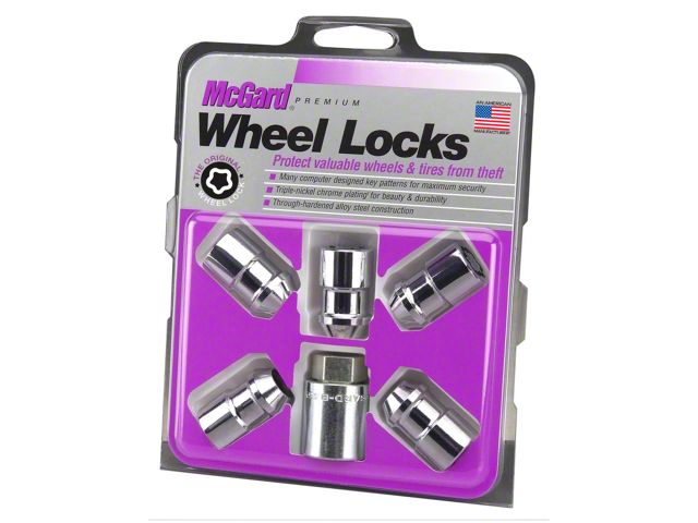 Protecting the world's finest wheels and tires from theft since 1964. McGard manufactures wheel locks in the USA to meet or exceed O.E.M. standards for safety and durability. Presently, McGard is an Original Equipment wheel lock supplier to most automobile brands around the world. These easy-to-use, one-piece wheel locks function like regular lug nuts, but require a special key tool for installation and removal. The steel collar on the user friendly key guides the key into the lock pattern. The collar holds the key in alignment for easy installation and removal. The computer generated key designs allow for an infinite number of key patterns. The extra narrow pattern groove on the lock resists the intrusion of removal tools into the pattern. Every McGard wheel lock is fully machined from restricted chemistry steel made specifically for McGard and through-hardened for its unsurpassed level of security. McGard's plating process includes several layers of nickel and one layer of microporous chrome producing a superior finish while protecting against rust. For use on sport/utility vehicles with O.E.M. rear mount spare tire carrier. One lock for spare, four locks for road wheels, one matching key. This product may contain globally sourced materials/components.