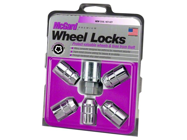 Protecting the world's finest wheels and tires from theft since 1964. McGard manufactures wheel locks in the USA to meet or exceed O.E.M. standards for safety and durability. Presently, McGard is an Original Equipment wheel lock supplier to most automobile brands around the world. These easy-to-use, one-piece wheel locks function like regular lug nuts, but require a special key tool for installation and removal. The steel collar on the user friendly key guides the key into the lock pattern. The collar holds the key in alignment for easy installation and removal. The computer generated key designs allow for an infinite number of key patterns. The extra narrow pattern groove on the lock resists the intrusion of removal tools into the pattern. Every McGard wheel lock is fully machined from restricted chemistry steel made specifically for McGard and through-hardened for its unsurpassed level of security. McGard's plating process includes several layers of nickel and one layer of microporous chrome producing a superior finish while protecting against rust. For use on sport/utility vehicles with O.E.M. rear mount spare tire carrier. One lock for spare, four locks for road wheels, one matching key. This product may contain globally sourced materials/components.