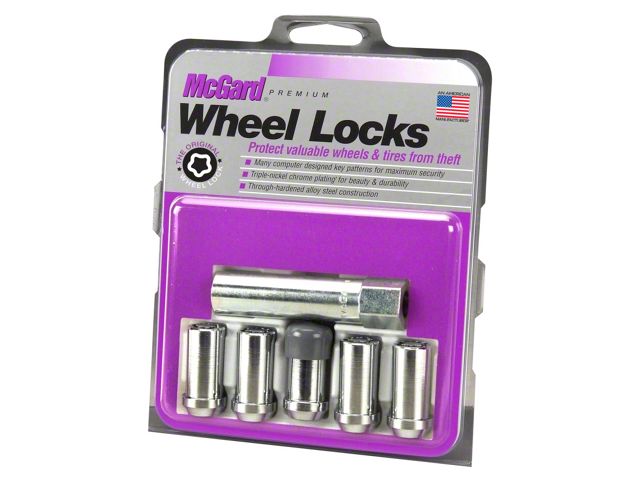 Protecting the world's finest wheels and tires from theft since 1964. McGard manufactures wheel locks in the USA to meet or exceed O.E.M. standards for safety and durability. Presently, McGard is an Original Equipment wheel lock supplier to most automobile brands around the world. These easy-to-use, one-piece wheel locks function like regular lug nuts, but require a special key tool for installation and removal. The steel collar on the user friendly key guides the key into the lock pattern. The collar holds the key in alignment for easy installation and removal. The computer generated key designs allow for an infinite number of key patterns. The extra narrow pattern groove on the lock resists the intrusion of removal tools into the pattern. Every McGard wheel lock is fully machined from restricted chemistry steel made specifically for McGard and through-hardened for its unsurpassed level of security. McGard's plating process includes several layers of nickel and one layer of microporous chrome producing a superior finish while protecting against rust. For use on Tuner wheels or wheels with very small lug nut holes. For use on sport/utility vehicles with O.E.M. rear mount spare tire carrier. Contains one lock for the spare tire, four for the road wheels and one matching key. For aluminum wheels only. This product may contain globally sourced materials/components.